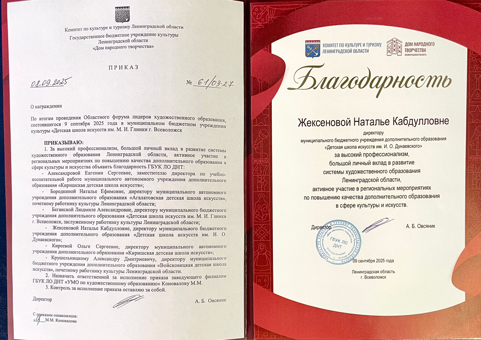 09.09.2025 во Всеволожске прошел Форум лидеров художественного образования Ленинградской области с участием Первого заместителя председателя комитета по культуре и туризму ЛО Мельниковой О.Л., директора ГБУК ЛО «ДНТ» Овсяник А.Б., заведующей филиала ДНТ «Учебно-методическое объединение» Коноваловой М.М.,, руководителей Детских школ искусств региона.
